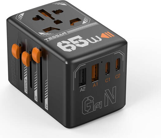 TESSAN Universal Travel Adapter, GaN 65W Total DC Output, 4 USB(2 USB C) Charging Ports, Worldwide Power Outlet for US to European EU UK AUS Ireland, Black | TS-WTA03-BK