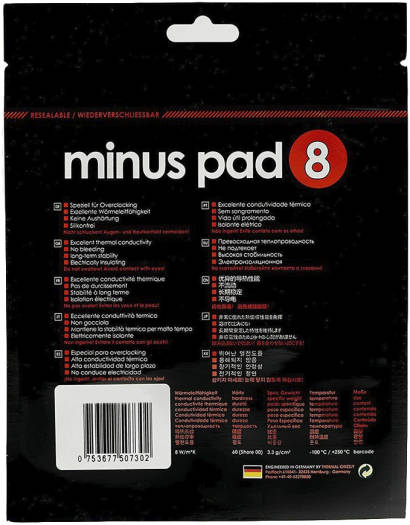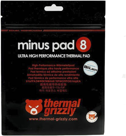 Thermal Grizzly TG-MP8-100-100-05-1R Minus Pad 8 – 100x 100x 0.5 Mm The high-performance thermal pads of the Thermal Grizzly minus pad series have a very elastic and adaptable surface with very high thermal conductivity. Even the smallest component differences can thus be compensated very well. Available in different dimensions and strengths. High thermal conductivity High compressibility Electrically insulating The easy to process and flexible minus pads consist of different c