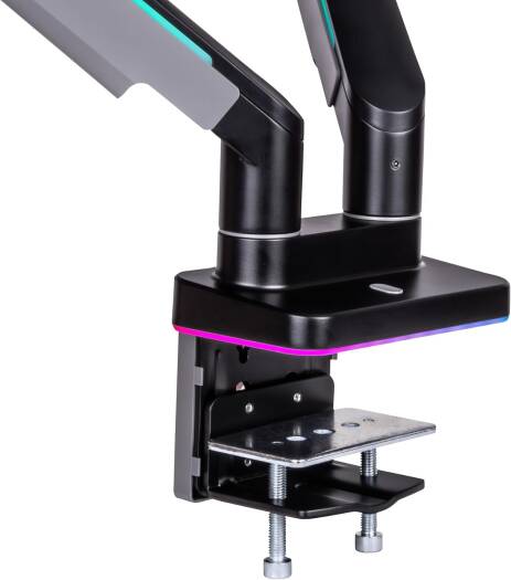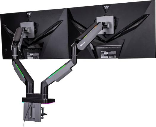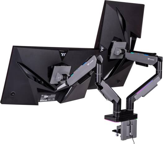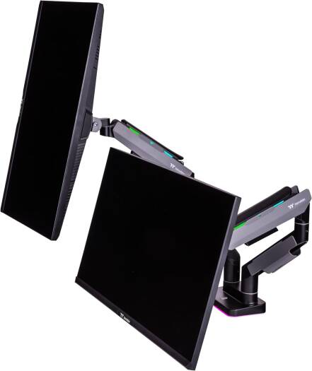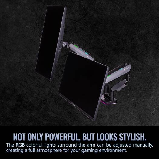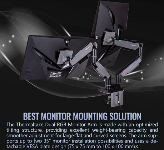 Dual RGB Monitor Arm The Dual RGB Monitor Arm is perfectly compatible with all the gaming desk and monitors from Thermaltake, providing a complete dual monitor installation solution for serious gamers and office workers. This dual monitor arm is made with a optimized tilting structure with a load of up to 20kg*2 (44Ibs*2). It supports detachable VESA plate designs with a maximum of 35″ monitor mounting, providing players with the most flexible installation to create an professional gaming environment.
