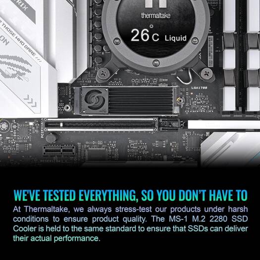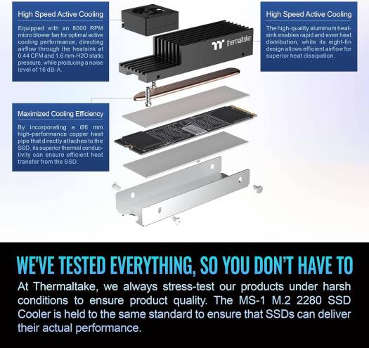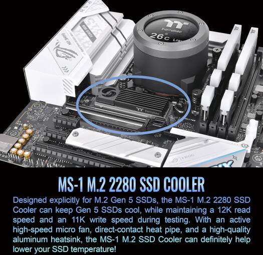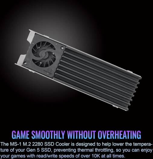 MS-1 M.2 2280 SSD Cooler Designed explicitly for M.2 Gen 5 SSDs, the MS-1 M.2 2280 SSD Cooler can keep Gen 5 SSDs cool, while maintaining a 12K read speed and an 11K write speed during testing. With an active high-speed micro fan, direct-contact heat pipe, and a high-quality aluminum heatsink, the MS-1 M.2 SSD Cooler can definitely help lower your SSD temperature!