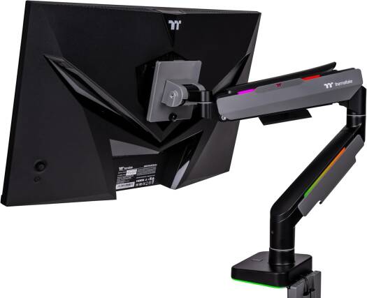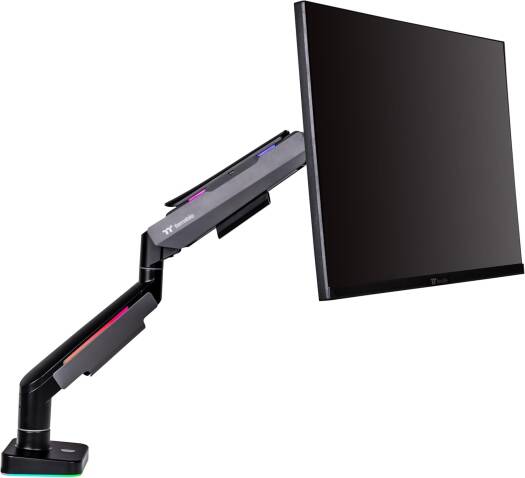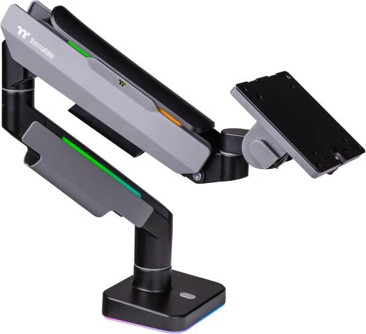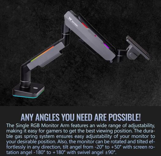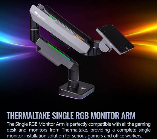 Single Heavy Duty RGB Monitor Arm Best Monitor Mounting Solution The Single RGB Monitor Arm is perfectly compatible with all the gaming desk and monitors from Thermaltake, providing a complete single monitor installation solution for serious gamers and office workers. This single monitor arm is made with a optimized tilting structure with a load of up to 20kg (44Ibs). It supports detachable VESA plate designs with a maximum of 49″ monitor mounting, providing players with the most flexible installation to create an professional gaming environment.