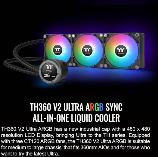 Thermaltake TH360 V2 Ultra ARGB Sync All In One Liquid Cooler /ARGB Fan 120 * 3 PWM Fans and Speeds Up to1500rpm / Water Block 2.1″ LCD / Black | CL-W384-PL12SW-A