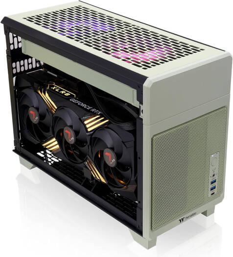 TR100 The TR100 Matcha Green Mini Tower Chassis is a compact, dual-chamber, Mini-ITX case that is designed for those who demand performance and portability. It supports an SFX power supply and features space for two 120mm or 140mm fans on the top, as well as room for a 280mm AIO cooler. Additionally, the separately sold suitcase allows users to carry the PC case and a complete gaming setup with them! Specifications Series