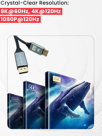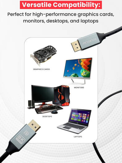 DP to DP Cable The Tortox 8K DisplayPort to DisplayPort Cable is a powerhouse that delivers unparalleled visual experiences. With support for 8K at 60Hz, 4K at 144Hz, and more, this cable ensures high-fidelity visuals with the fastest refresh rates. Boasting a