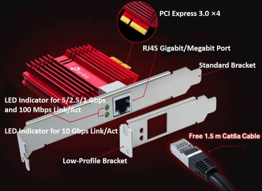 TP-Link 10 Gigabit PCI Express Network Adapter, CAT6A Ethernet Cable, Low-Profile and Full-Height Brackets, Supports Windows 11/10/8.1/8/7, Windows Se