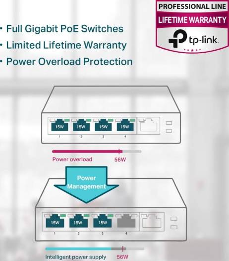 Product description What This Product Does TL-SG1005P is a 5 10/100/1000Mbps ports unmanaged switch that requires no configuration and provides 4 PoE (Power over Ethernet) ports. It can automatically detect and supply power with all IEEE 802.3af compliant Powered Devices (PDs). In this situation, the electrical power is transmitted along with data in one single cable allowing you to expand your network to where there are no power lines or outlets, where you wish to fix devices such as APs, IP Cameras or IP Phones, etc. Power over Ethernet 4 of the 5 Auto-Negotiation RJ45 ports (Port 1 to Port 4) of the switch support Power over Ethernet (PoE) function. These PoE ports can automatically detect and supply power with those IEEE 802.3af compliant Powered Devices (PDs).Overload Arrangement TL-SG1005P has the priority function which will help protect the system when the system power is overloaded. If all PoE PDs power consumption is >= 56W, a priority will be arranged among the PoE ports, then the system will cut off the power of the lowest-priority port.Port Priority Function Priority (Port 1=Port 2=Port 3>Port 4): This function will help to ensure the normal operation of the system, it means Port 4 will be cut off when