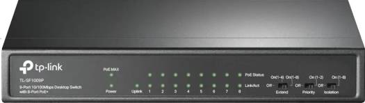 The TP-Link 9-port Desktop Switch has a high-quality metal casing to protect the components inside and to ensure a long product life. 9× 10/100Mbps RJ45 ports 8x PoE+ ports transfer data and power on individual cables Works with IEEE 802.3af/at compliant PDs One-click Priority Mode Isolation Mode for security Supports PoE Power up to 30W for each PoE port Supports PoE Power up to 65W for 8 PoE ports Transmission distance up to 250m under Extend Mode Durable metal casing Plug and play Professional ports for numerous applications It complies with the 802.3af/at PoE+ standard and supports up to 30W on each PoE port. The total 65W PoE power budget for the 8x PoE+ ports opens up a wide range of applications, such as surveillance for offices, dormitories and small businesses. It is fully compatible with IP cameras, access points, IP phones, computers, printers and more. Priority video quality guaranteed Quality of sensitive applications like video monitoring in critical business areas is guaranteed by offering higher priority options for ports 1 and