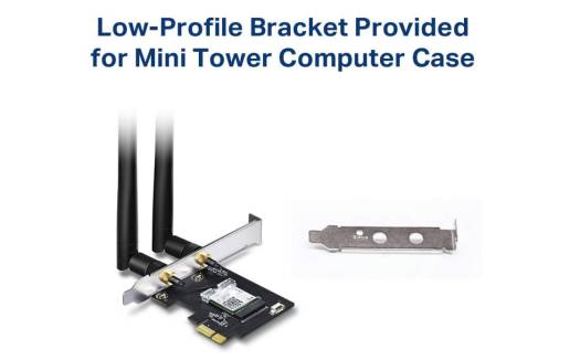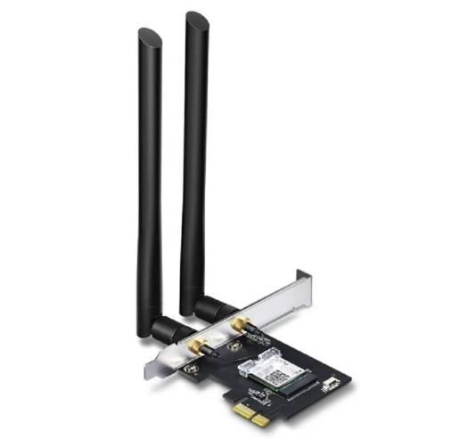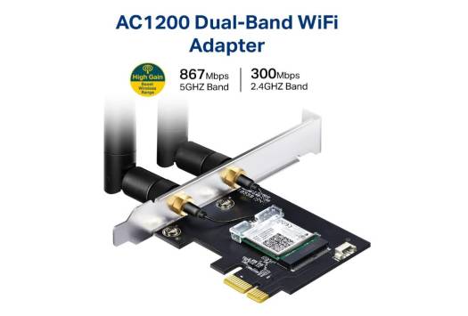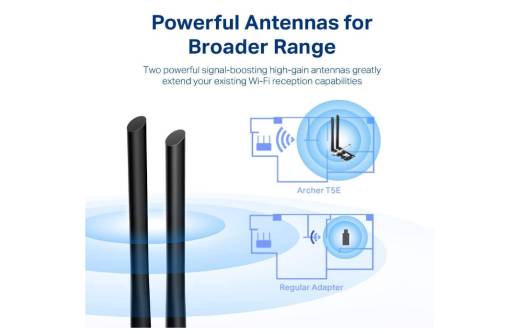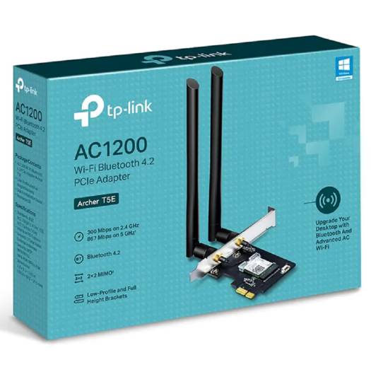 TP-Link Archer T5E AC1200 Wi-Fi Bluetooth PCIe Adapter Ultra-Fast Speed – Make full use of your network with Wi-Fi speeds up to 1167 Mbps (867 Mbps on the 5 GHz band and 300 Mbps on the 2.4 GHz band) Bluetooth 4.2 – Achieve 2.5× faster speed and 10× more packet capacity than Bluetooth 4.0 Broad Wireless Range – Connect to your Wi-Fi in more parts of your home with two external high-gain antennas ensuring greater coverage and enhanced stability Easy Installation – Plug the adapter into an available PCI-E slot to upgrade your desktop