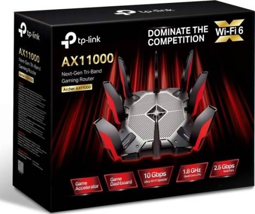 Next-Gen Tri-Band Gaming Router Archer AX11000. Higher speeds make less congestion for gaming rigs. Armed with Wi-Fi 6, Archer AX11000 becomes the next-level speed machine that offers astonishing Wi-Fi speeds up to 10756 Mbps with an extended range. Ultra-Fast Wi-Fi for Extreme Gaming – AX11000 speed machine that delivers 12-streams Wi-Fi Speeds Over 10 Gbps: 4804 Mbps (5 GHz Gaming) + 4804 Mbps (5 GHz) + 1148 Mbps (2.4 GHz) Game Accelerator – Detect and optimize gaming streams, to ensure your gaming stays immersive Game Protector – Keep your accounts and documents safe with a Homecare security system powered by Trend Micro Game Statistics – Real-time latency, game duration, and network resource allocation in a glance with fine-tuned UI Ultra Connectivity – 2.5 Gbps WAN port and eight Gigabit LAN ports, 2 USB 3.0 in Type A and Type C provides extensive connectivity Powerful Processing – 1.8 GHz Quad-Core CPU and 3 coprocessors ensure your network performance always at peak run Highly Efficient – OFDMA increases the avg. throughput and reduces the lag SPEED: 1148 Mbps at 2.4 GHz + 4