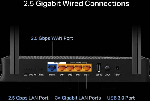 | Ethernet Ports | 1× 2.5 Gbps WAN | 1× 2.5 Gbps LAN | 3× 1 Gbps LAN |