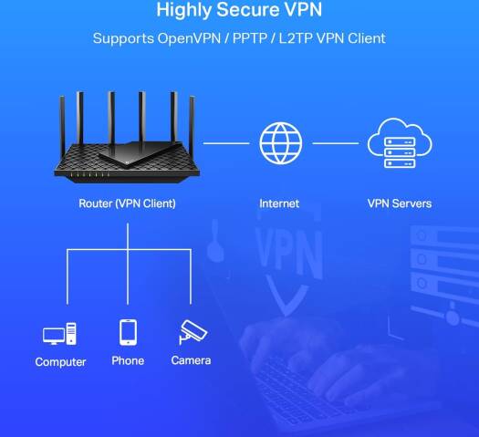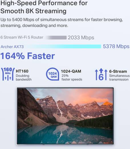 The latest generation of Wi-Fi technology brings faster speeds, less lag, and higher capacity, enabling more simultaneous connections on your home network.Warp Speed for Smooth 8K StreamingDrastically improved speeds enable streaming, fast downloading, and gaming, all at the same time. Need to go faster. Hop on 5 GHz with full speed-boosting features to stream multiple 8K videos without lagging.Extensive Wi-Fi Coverage with Advanced TechnologyEnjoy stable Wi-Fi connections, even in the kitchen and bedroom. High-Power FEM, 6 Antennas, Beamforming, and 4T4R structures combine to adapt Wi-Fi coverage to perfectly fit your home and concentrate signal strength towards your devices. Up to 4x more capacity to easily handle dozens of devices streaming and gaming at the same time OFDMA and MU-MIMO combine to future-proof your home network by providing greater capacity to connect more devices.Designed to Be CoolThe slant rectangle atop of the scaled armor design provides a contemporary aesthetic. The vent design takes up 167 cm² (25 in²) of its top surface for improved heat dissipation, unleashing the whole machine's full power.TP-Link HomeShield: Advanced Security for Unlimited ClientsHomeShield protects all connected clients against DDoS, malicious sites, and port intrusion, delivering a safe network environment for your data and privacy.TP-Link OneMesh: Flexibly Create Whole Home WiFi with Archer AX73Want to build a whole-home Wi-Fi. Archer AX73 supports OneMesh to for