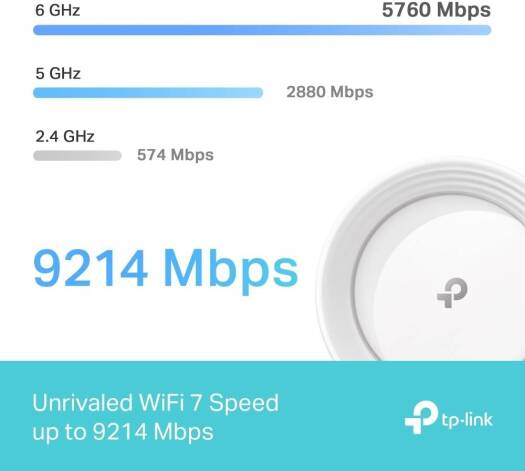 TP-Link Deco BE65 (2-Pack x 4) Home Mesh WIFI 7 Router Specification Attribute Details Wireless Standards Wi-Fi 7, IEEE 802.11be/ax 6 GHz, IEEE 802.11be/ax/ac/n/a 5 GHz, IEEE 802.11ax/n/b/g 2.4 GHz WiFi Speeds 6 GHz: 5760 Mbps (802.11be) 5 GHz: 2880 Mbps (802.11be) 2.4 GHz: 574 Mbps (802.11ax) WiFi Range Broader Whole Home Coverage TP-Link Mesh Technology SKU: SKU-C557B299 Category: Routers Brand: TP-LINK