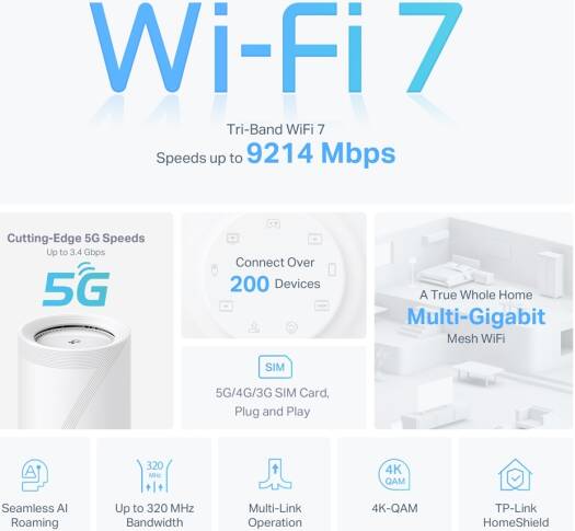 | Advanced Functions | Multi-Link Operation (MLO), 320 MHz Channel, 4K-QAM, Multi-RUs, Works with Alexa and Google Assistant, IoT Network |
