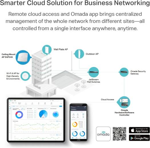 Simultaneous 450Mbps on 2.4GHz and 1300Mbps on 5GHz totals 1750Mbps Wi-Fi speeds -supports seamless roaming so even video streams and Voice calls are unaffected as users move between locations -free cloud centralized management and omada app for ultra convenience and easy management -support power over -Ethernet.3at/802.3af) for convenient and affordable installation -secure guest network along with multiple authentication options (SMS/Facebook Wi-Fi/ -voucher, etc.) and abundant wireless Security technologies. -Band Steering automatically moves Dual-Band devices onto the wider 5GHz band for faster connections -load balance ensures large numbers of users have smooth network experiences in high-density business networks -supports management VLAN for an enhanced network management.