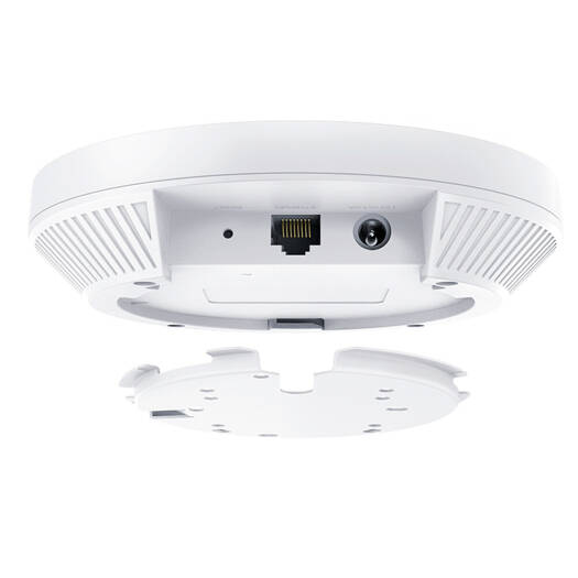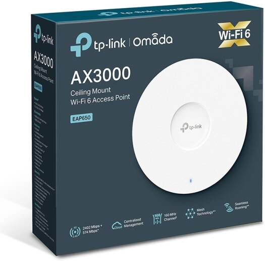 EAP650 AX3000 Ceiling Mount WiFi 6 Access Point Ultra-Fast WiFi 6 Speeds: Simultaneous 574 Mbps on 2.4 GHz and 2402 Mbps on 5 GHz totals 2976 Mbps WiFi speeds. 160 MHz Channel : Double the data at peak transmission times on a single stream with HE160. Seamless Roaming : Video streams and voice calls are unaffected as users move between locations. Omada Mesh: Enables wireless connectivity between access points for extended range and flexible deployment. PoE+ Powered : Supports both 802.3at PoE+ and DC (adapter included) power supply for flexible installations. Ultra-Slim Design : Φ160 mm × 33.6 mm elegant design brings more agility.