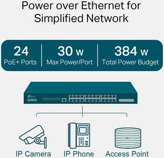 384 W PoE Budget : 24× 802.3at/af-compliant PoE+ ports with a total power supply of 384 W * . Full Gigabit Ports : 24× gigabit PoE+ ports and 4× gigabit SFP Slots provide high-speed connections. Integrated into Omada SDN : Centralized Cloud Management, and Intelligent Monitoring. Centralized Management : Cloud access and Omada app for ultra convenience and easy management. Static Routing : Helps route internal traffic for more efficient use of network resources. Robust Security Strategies : IP-MAC-Port Binding, ACL, Port Security, DoS Defend, Storm control, DHCP Snooping, 802.1X, Radius Authentication, and more. Optimize Voice and Video Applications : L2/L3/L4 QoS and IGMP snooping. Standalone Management : Web, CLI (Console Port, Telnet, SSH), SNMP, RMON, and Dual Image bring powerful management capabilities.