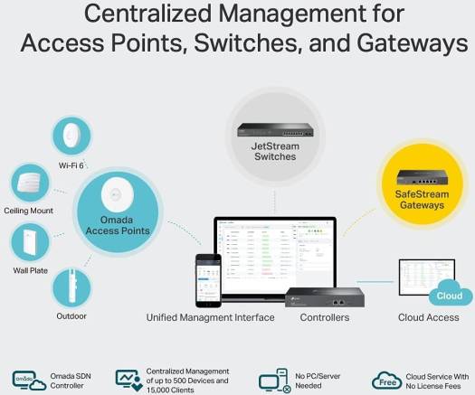 | Centralized Management | • Up to 500 Omada access points, |