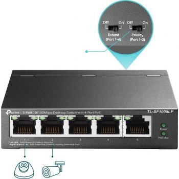 TP-Link PoE Switch TL-SF1005LP is a non-manageable PoE Switch with 5x 10/100Mbps , one is for uplink without PoE and the remaining 4 ports supports PoE-Out with standards 802.3af (up to 15,4W/port). The total PoE budget switch is 41W . The switch also supports with turned on extend mode, the PoE transmission distance reaches up to 250m – perfect for IP Camera deployment in large areas. Other swithche bonuses are priority PoE and Inteligent power management. Dedicated 4-Port PoE Switch (41 W Budget) for Numerous Applications Compliance with the 802.3af PoE standard supports up to 15.4 W on each PoE port. The total 41 W PoE power budget* for the 4× PoE ports opens up a wide range of applications, such as surveillance for offices, dormitories, and small businesses. It is fully compatible with IP cameras, access points, IP phones, computers, printers, and more.