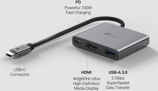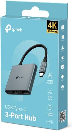 Tp-Link USB Type-C 3 in 1 Hub, 4K HDMI, PD 100W, USB 3.0, Plug & Play, 5 Gbps SuperSpeed Data Transfer, Windows, Mac, Linux, iPadOS, iOS, Android, Chrome | UH3020C