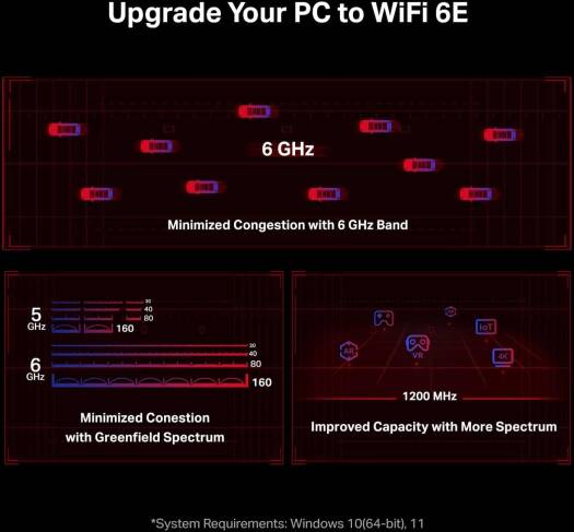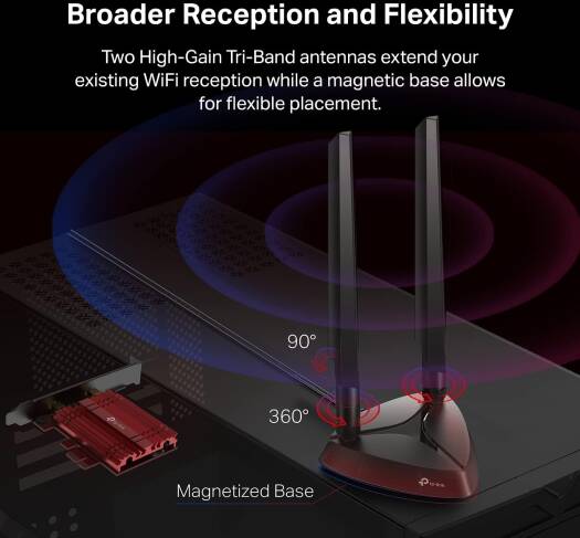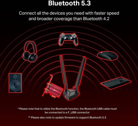 Arm Your PC with Next-Gen WiFi 6E TechnologyAXE5400 Wi-Fi 6E Bluetooth 5.3 PCIe AdapterNext-Level GamingThe very latest Wi-Fi 6E standard provides faster speeds, ultra-low latency, and uninterrupted connectivity. Utilizing the Wi-Fi 6E foundation, Archer TXE75E is designed to liberate your gaming from cables and fully optimize your gameplay. Discover the missing component of your gaming arsenal!Stay Immersive160 MHz bandwidth deliver powerful, continuous WiFi to fully unlock the potential of your Wi-Fi 6E router. Wi-Fi 6E drives your PC to peak performance so your setup keeps pace with your jaw-dropping skills.Broader CoverageTwo multi-directional and high-performance antennas with a magnetized base extends your existing WiFi reception capabilities, allowing you to game anywhere and anytime. Place the magnetized antenna base anywhere on your desktop to find the optimal location for signal reception.Bluetooth 5.3 CompatibleArcher TXE75E is compatible with the latest Bluetooth 5.3 technology, achieving 2 faster speed and 4 broader coverage than Bluetooth 4.2. Connect as many devices as you want including game controllers, headphones, and keyboards, to enjoy a smoother experience. Please note that while the packaging shows Bluetooth 5.2 support, you can update the firmware from the TP-Link website to support Bluetooth 5.3. Please also note that to utilize the Bluetooth function, the Bluetooth USB cable must be connected to a F_USB connector***Advanced SecurityThe latest secur
