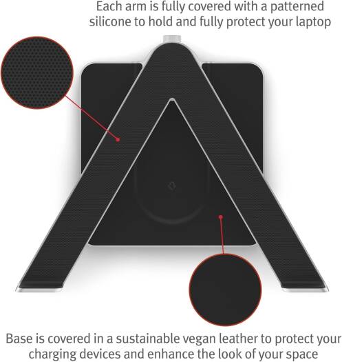 Introducing the Twelve South HiRise, the ultimate MacBook stand designed to enhance your workspace and improve your laptop's performance. Crafted from durable aluminium, this stand provides a sturdy base for all sizes of MacBooks and laptops, ensuring lasting performance. The entire surface of each arm is covered with patterned silicone to protect your device and prevent accidental slips or falls, while the upturned ends add an extra layer of security. One of the standout features of the Twelve South HiRise is its integrated MagSafe charging capability. Simply insert a MagSafe charging disk (not included) under the leather base into a special channel to wirelessly charge your iPhone or AirPods without taking up extra space on your desk. The charging section is elevated to accommodate larger iPhone cameras, allowing them to lay completely flat for efficient charging. Designed with ergonomics in mind, the HiRise allows you to easily adjust the height of your MacBook or laptop up to 6 inches using the rear piston. This adjustability helps reduce neck strain and improve your overall posture during long hours of work. Additionally, the arms of the stand keep your laptop base exposed, improving airflow and cooling for quieter performance. Whether you need a MacBook Pro stand, a MacBook Air stand, or a versatile laptop stand for your desk, the Twelve South HiRise is the perfect solution. Its sleek design and practical features make it an essential addition to any workspace, enhan