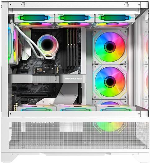 Twisted Minds Phantek-07 Mid Tower ATX Gaming PC Case, Tempered Glass Front & Side Panel + Mesh, 7x RGB Pre-installed Fans, 3.5″ HDD*3+2.5″ SSD*3 Up to 420mm AIO, USB 3.0 / Type-C*, White | TM-245-3-W