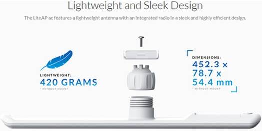 LiteAP ac Access Point Ideal for the deployment of long-distance outdoor broadband, the LiteAP ac Access Point from Ubiquity is a lightweight, pole-mountable access point that operates in the 5 GHz frequency band. Capable of long-distance wireless links in excess of 19 miles, the 16 dBi LiteAP ac employs Ubiquity’s AirMAX TDMA protocol to boost performance and throughput, as well as to reduce latency. Key Features Designed for Outdoor Wireless Broadband 5 GHz Frequency Band Up to 16 dBi Antenna Gai