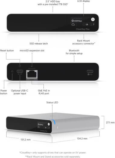 Ubiquiti Networks Cloud Key, Gen2, 1TB 2.5″ SATA SSD, 802.3af PoE, Front Panel Display, Hybrid Cloud Technology, 2 USB-C Ports, MicroSD Card Slot, Gigabit Ethernet Poe+ Port, Silver | UCK-G2-SSD