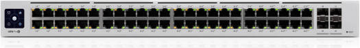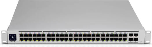 Switch Pro 48 PoE Expand your business’s network with the fully manageable second-generation UniFi Pro PoE 48-Port Gigabit Managed PoE Network Switch with SFP+ from Ubiquiti . Designed with Layer 3 protocol support, the passively cooled 48-port Gigabit switch features a total power budget of 600W across 40 32W PoE connectors and eight 64W PoE++ ports for power-intensive devices such as high-resolution network security cameras. Each port delivers 88 Gb/s non-blocking throughput with a 176 Gb/s switching capacity and a 130.94 Mpps forwarding rate. Four 10 Gb/s SFP+ ports are available for additional network expansion using compatible devices. Administrators may monitor and manage the switch with the 1.3″ touchscreen display or access and configure it and connected devices using the UniFi Network Controller application.