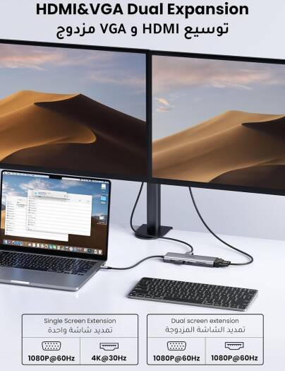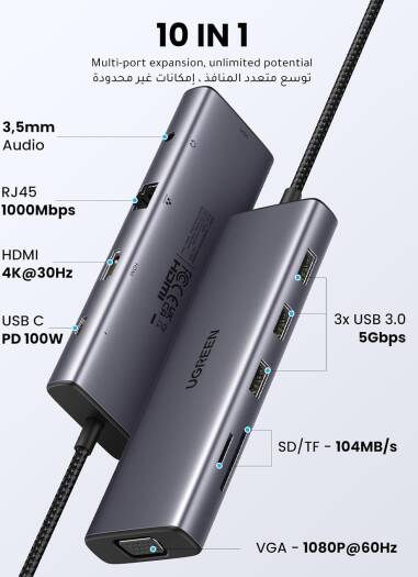UGREEN 10 in 1 USB C Hub, Up to 4K @ 30Hz Display, 1Gbps Ethernet Speed, 100W Passthrough, 5Gbps Data Transfer Rate, 3.5mm Audio, RJ45 Ethernet, HDMI, USB-C, 3x USB-A, SD/TF Card Slot, VGA | 15601