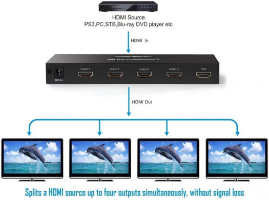 1×4 HDMI Amplifier Splitter UGREEN’s 4-Port HDMI Splitter is a high-performance device that splits one HDMI input into four identical HDMI outputs. It allows you to connect four TVs, monitors, or projectors to a single HDMI source device, such as a Blu-ray player, gaming console, or computer. Specifications Input Interface 1 x HDMI Output Interface 4 x HDMI Resolution Up to 4K (3840×2160)
