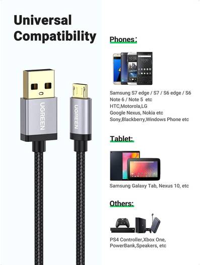 Perfectly Match Quick Charger: Ugreen micro usb cable braided supports Quick Charge technology, greatly save charging time for you. For QC 2.0/3.0 enabled devices, output up to max 18W (12V/1.5A 9V/2A 5V/2A); for standard Non-QC 2.0/3.0 devices, output up to max 5V/2A. Universal Compatibility: This micro usb charger cable is compatible with most Android Cell Phones, Tablets, Windows Phones (such as Note 3/4/5, Galaxy S3/S4/S5/S6 Edge S7, Nokia Lumia, LG, HTC), MP4, hard drives, PlayStation 4, more portable devices with micro usb interface. Everlasting Durability: You can plug the gold plated connector in your devices slot quite easily and steadily, and won’t get loose or fall out from your devices as your normal micro usb cables. The Nylon braided outer of the usb to micro usb cable is quite robust and flexible, making cables tangle free and everlasting. Build To Last: this usb charger cable is with premium nylon braided ho