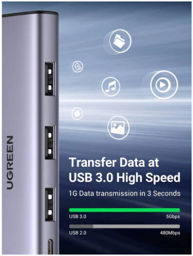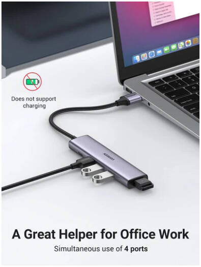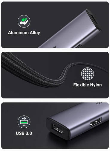 UGREEN 4 in 1 USB 3.0 Hub, 3x USB 3.0 Ports, 4K@30Hz HDMI, 5 Gbps Transfer Speed, External Power-Port, Plug & Play, High Speed Transfer, Braided in Nylon Cable, Brilliant Thermal Design, Gray | 20805