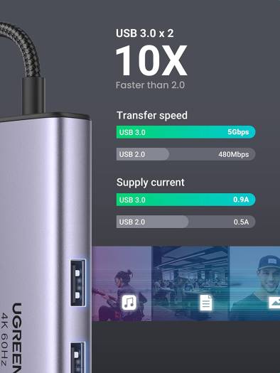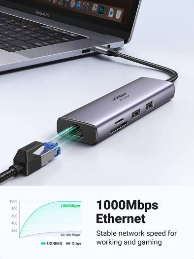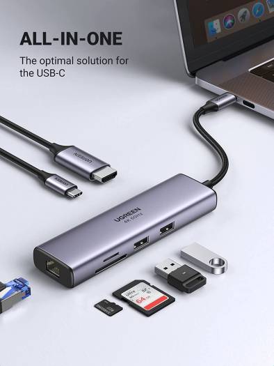 UGREEN 7 in 1 USB-C hub features a 1000Mbps Ethernet port, 4K@60Hz HDMI port, USB C charging port with 100W power delivery, SD/TF card reader, and 2 USB 3. 0 ports. Connect to the latest MacBook Pro or USB-C devices with the multiport adapter to bring convenience to your work. Sync in 4K@60Hz Simply connect with the HDMI port and you can project UHD 4K@60Hz/30Hz or Full HD 1080p 60Hz video content on HDTV, Monitor, or projectors. Stream movies, presentations, or video games on your monitors in one click.(Note: The 4K@60Hz only available for laptops with DisplayPort 1.4 and 8K enabled).