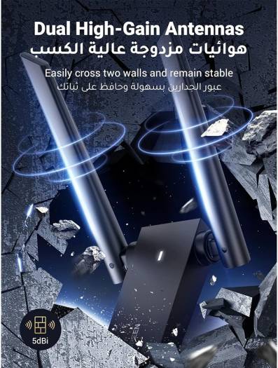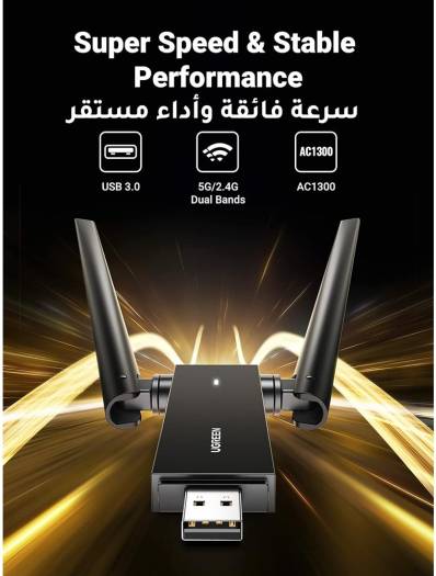 Ugreen AC1300 USB Wi-Fi Adapter, USB 3.0, 5dBi Dual Antennas, 2.4GHz/5GHz Up to 867Mbps, 5Gbps Data Transfer, WPA/WPA2/WEP Protection, Black | 50341