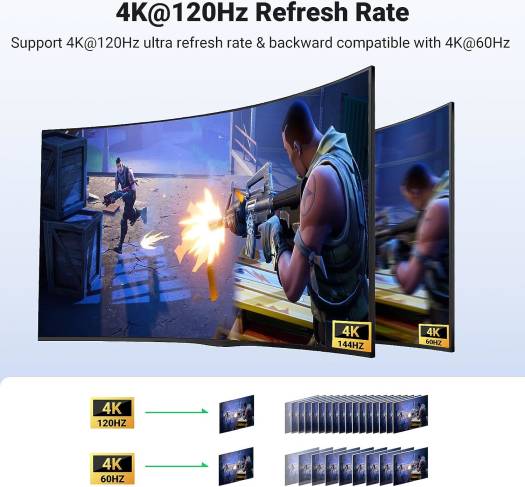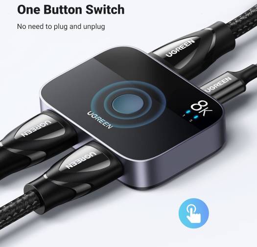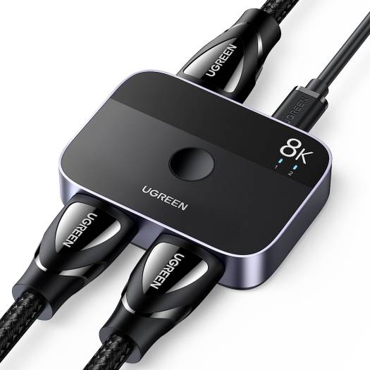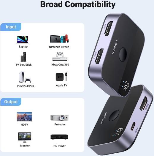 UGREEN 8K Bi-directional HDMI Switch Higher Quality Resolution – Our HDMI 2.1 switch supports the latest 8K@60hz, 4K@120hz, 1080P@240Hz resolutions, giving you the best resolution for your viewing pleasure. It’s backward compatible & supports HDMI 2.1/2.0/1.4, VRR and Dynamic HDR Chroma 4:2:0 / 4:2:2 / 4:4:4. Also it’s Dolby Vision & HDCP2.3 compliant. All HDMI ports support HDR/3D, but only HDMI in 1 supports CEC function. Tip: If you want 8K@60HZ, the HDMI 2.1 cable should be input within 2M and output within 3M. 2 in 1 out HDMI Switch – UGREEN 2 in 1 out HDMI switch allows connecting 2 input devices such as PS5, XBOX, PC with your output device such as monitor, HDTV or projector for video output, which saves the plug and re-plug, easily switching between the 2 devices with one button. The HDMI 2 in 1 out video switch is a good choice for home entertainment and office. 1 in 2 out HDMI Splitter – The 2 way HDMI selector also works as HDMI Splitter, enables you to connect your major d