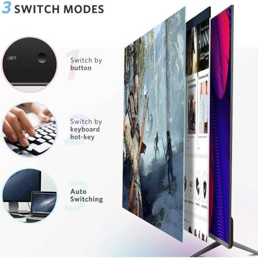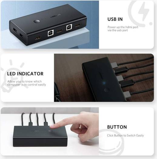 KVM Switch 2 Port HDMI -UGREEN KVM switcher allows you to control 2 computers with only the 4K display screen and one set of controls(mouse and keyboard). It is a great expansion for workstations, office or anywhere multitasks between computers. Extended 4 Ports USB HUB – This USB HDMI switch box comes with USB 4 Ports, which allows you to connect one set of keyboard and mouse, together with two USB 2.0 port of 480Mbps high speed. High Definition Video Output -KVM switch HDMI supports high-definition image and supports maximum resolution up to 4K@30Hz, compatible with 1080P@60hz. The adapter supports video and audio at the same time <div class="a-section launchpad-mo