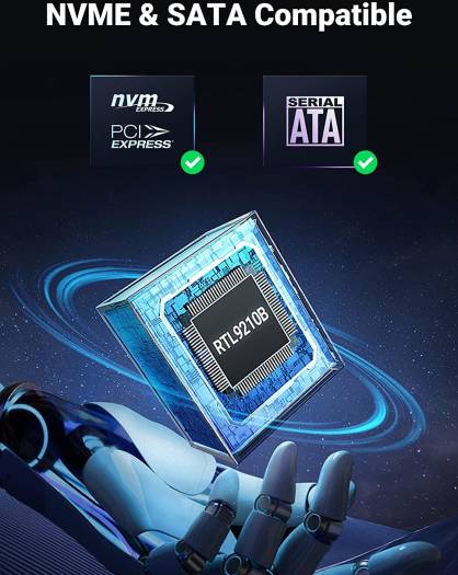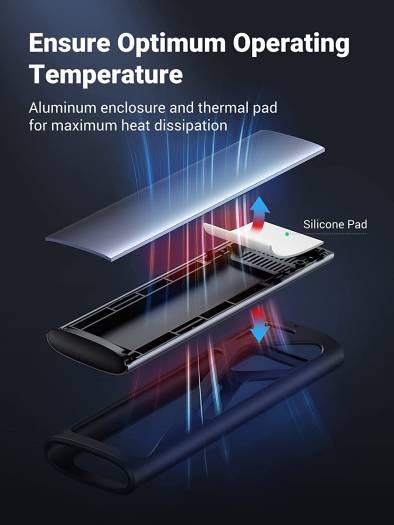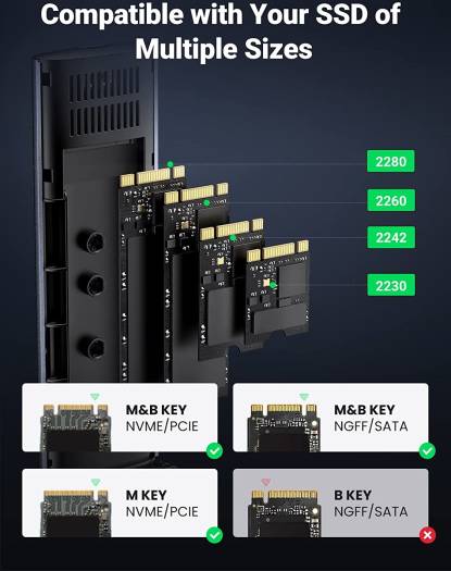 10Gbps M.2 NVMe SATA Enclosure – This M.2 enclosure is compatible with both NVMe and SATA protocols, USB C 3.2 Gen2 makes the NVMe enclosure data transmission speed up to 10Gbps, Thunderbolt 3 compatible. 6Gbps speed as an M.2 SATA enclosure. Tool-free SSD Enclosure – Tool-free NVMe SSD enclosure allows quick and easy installation. Plug and play, no driver needed. Buckle design of the M.2 SSD enclosure can help fix to greatly ensure steady and speedy transmission. Broad Compatibility – UGREEN M.2 NVMe SSD enclosure is specially designed for M and B&M Keys and size 2230/ 2242/ 2260/ 2280 SSDs above 2TB. The SSD reader is applicable to Windows, Mac OS, Linux, Android, IOS systems. Note: Not support M-SATA. Safety and Stability – NVMe reader adopts an advanced RTL9210B chip, built with short-circuit, over-current and multi-protection to ensure safety for your SSD and valuable data. Support UASP/ Trim with fast transmission speed. Compact and Portable – Ultra-slim aluminum case with an extra silicone case, portable yet durable, much