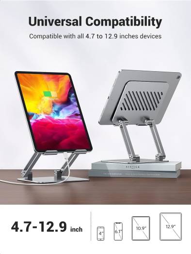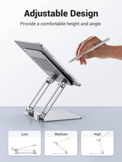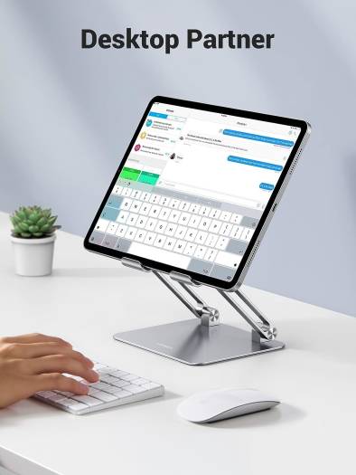 UGREEN iPad Stand: Your Versatile Device Companion Elevate your tablet and phone experience with the UGREEN iPad Stand. Crafted with a solid and airy design, this stand offers sturdy support and excellent ventilation, preventing overheating during video meetings, movie nights, gaming, or creative sessions. Its multi-angle adjustability ensures the perfect viewing angle, while anti-slip features keep your devices secure. Plus, it’s portable and foldable, making it an ideal travel companion. Compatible with a wide range of tablets and phones, including iPad, Surface, Switch, and Galaxy Tab, this stand is the ultimate accessory for your digital lifestyle. Solid & Airy Design: This iPad stands for a desk and is composed of a super sturdy metal-weighted base, and an aluminum dual rod, which is strong enough to accommodate your phone and tablets. The open aluminum design provides good ventilation and airflow to prevent your iPad from overheating. Multi-Angle Adjustable: The UGREEN iPad stand allows you to customize the angle of your device. Just adjust the iPad stand holder and choose th