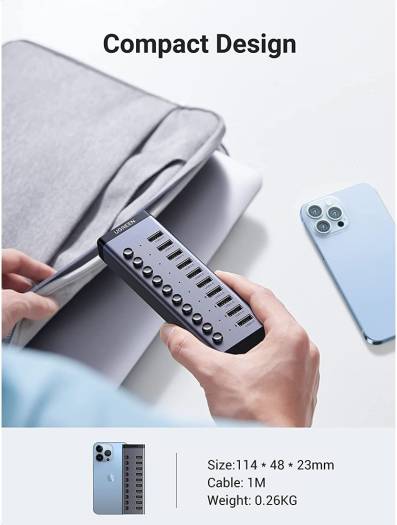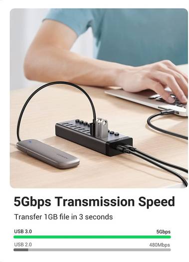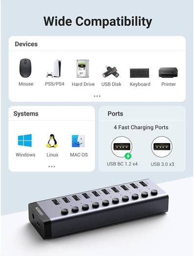 7-ports USB A hub This UGREEN USB Hub 3.0 data splitter can instantly expand 1 USB 3.0 port to 7 external USB 3.0 data ports for keyboard, mouse, printer, hard drivers, and more USB devices, syncing data at blazing speeds up to 5Gbps in no time. Powered USB Hub for Charging Besides SuperSpeed USB 3.0 ports, this USB 3.0 splitter also offers charging powered ports, which are able to charge your iPhone, iPad faster and safer. With the 12V 2A power adapter, it can provide charging power up to 3.4A.(Note: Please use the special four USB charging ports for charging preferentially, which can provide the charging speed of BC1.2.) Simple Switch to Control Equipped with individual on-off switches to control each USB port, UGREEN USB 3.0 hub saves the trouble of unplugging devices, places them more rationally when you don’t use them, and ensures that all connected devices operate more safely. Maximum Compatibility and Performance The USB port splitter hub is ideal USB ports expansion for devices such as NUC, tablets, laptops, Desktop computer with the operating system such