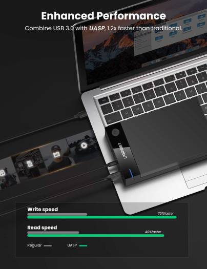 Great Portability, Get the Best Out of Your Both 3.5″ and 2.5″ Hard Drive Ideal for harnessing your 3.5 “/2.5″HDD and SSD hard drive as an external USB drive, it will provide you greater convenience of use and versatility of digital data storage. An ideal choice for digital lovers, movie lovers and business elites. 5Gbps USB 3.0 with UASP, Faster and More Efficient The enclosure comes with the USB 3.0 connection enhanced with the UASP protocol, and significantly increases the data transfer rate, delivering up to 70% faster performance than conventional USB 3.0, quickly back up your photos, video, movie, games from your computer to the SATA Drive for storage. SKU: SKU-6DD46F82 Category: HDD / SSD Accessories Brand: UGREEN