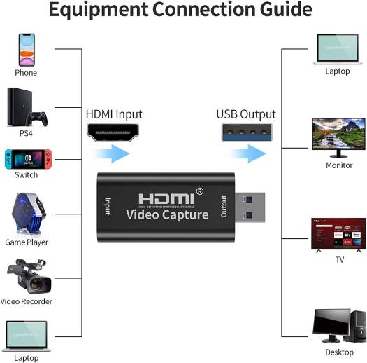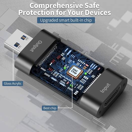 Highlights Support maximum input resolution up to 4K, support maximum output resolution up to 1080P. Support most acquisition software, such as VLC, OBS, Amcap, etc.. Support for Windows, for Android and for Mac OS. Comply with USB video UVC specifications. Overview Specifications: Support maximum input resolution up to 4K, support maximum output resolution up to 1080P. Support most acquisition software, such as VLC, OBS, Amcap, etc.. Support for Windows, for Android and for Mac OS. Comply with USB video UVC specifications. Complies with USB audio UAC specifications. Plug and play, no external power supply. Compact size and easy to carry. Item Name: Video Capture Card Material: ABS HDMI Resolution: Maximum Support 4K Video Input Format: 8-bit/10-bit/12-bit Color Depth Video Output Mode: YUV, JPEG Video Output Resolution: 1080P (Max.) Support Audio F