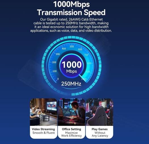Stable & Faster Gigabit Ethernet Cat6 UTP Ethernet Patch Cable Proprietary Molded Connector The fully molded connectors protect the inner conductors from moisture and contaminants that may cause corrosion or signal degradation. 1000Mbps Transmission Speed Our Gigabit rated, 26AWG Cat6 Ethernet cable is tested up to 250MHz bandwidth, making it an ideal economic solution for high bandwidth applications, such as voice, data, and video distribution.