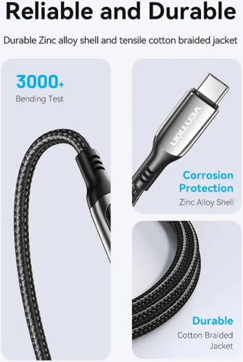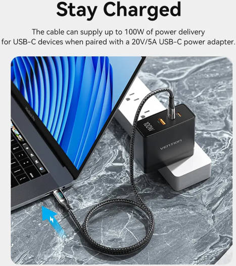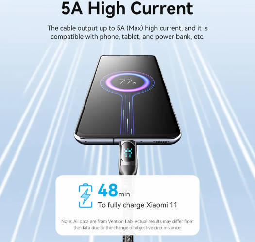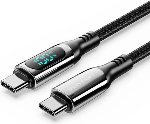 Vention USB 2.0 Type-C Cable, Male to Male, LED Display, 5A Rated Power, 480Mbps Data Transfer Speed, Nickel-Plated, Zinc Alloy Connector, E-Marker Chip, 2m Cable Length, Black | TAYBH