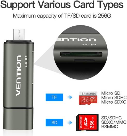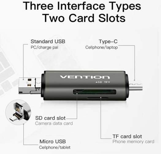 Vention USB Card Reader is ideal for your laptops/tablets/smartphones to expand two SD card slots, make transfering file/photos/videos more convenient. Supports SDXC/SDHC/SD/MMC/RS-MMC/Micro SD/TF /Micro SDXC/Micro SDHC/UHS-I memory cards. Read two cards at the same time to keep you away from the hassle of constant unplugging and re-plugging. Plug and play, no drivers required.compatible with Windows XP/Vista/7/8/8.1/10, Mac OS, Android. Faster data transfer rate up to 5Gbps.