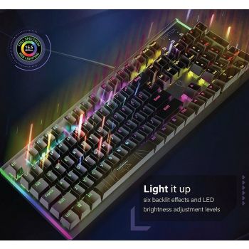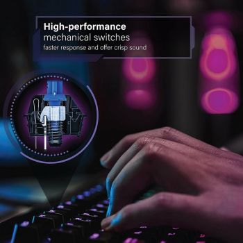 Feel the rush with each keystroke using the 104-key keyboard, Commando. The keyboard boasts 6 rainbow light effects with brightness adjustment features to let you customize your gaming setup’s centerpiece with perfection. With 100% anti-ghosting keys, don’t worry about multiple key presses while playing your favorite games. Features: • High-Performance Mechanical Switches: Commando features precision switches, which offer consistent tactical feel for faster response and offer crisp sound. • Stunning Looks Meet Ergonomics: No matter where you are, this gaming keyboard lightens up the environment and lets you play precisely and comfortably with its ergonomic design. • Light It Up: With six backlit effects and LED brightness adjustment levels, customize your keyboard’s lighting modes as per your needs and preferences. • Unbreakable Durability: Commando is designed with sturdiness, making it perfect piece for your ultimate gaming setup.