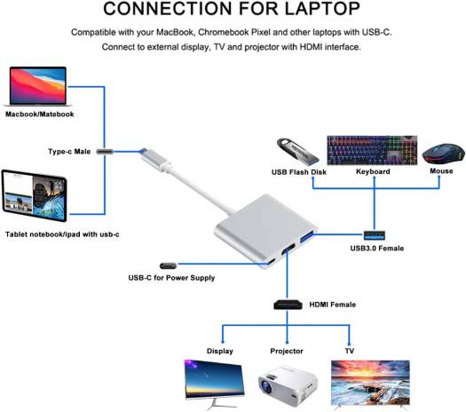 Versatile USB-C to HDMI Adapter for Seamless Connectivity Easily connect your USB-C-enabled devices to HDMI displays with this adapter. Enjoy 4K resolution and fast data transmission for a seamless multimedia experience. Charge your laptop or other devices effortlessly, and enjoy the convenience of plug-and-play operation. Note: This adapter is primarily for use with PCs and laptops. USB 3.0 with 5Gbps data transmission speed, use the standard USB port to connect devices such as your flash drive or camera or a USB cable for charging your iPhone, iPad, iPod, etc. HDMI output supports up to 4k*2k resolution and compatible with 1080P , 720P.With this adapter, you can easily share your movies with your friend on a larger TV/monitor/projector with an HDMI port from your Type C computer. The Type C port allows you to charge for Macbook, Dell, Asus, HP, etc Laptop and other devices Type C port,5W-60W automatically adaptive. plug easily without checking the connector orientation. SKU: SKU-BD0A625E Category: Adapters Brand: Generic