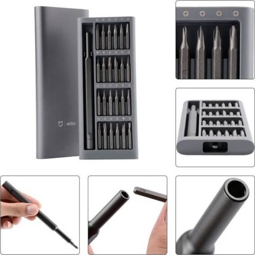 [Aluminum alloy storage container] High-precision one-piece molding process, Smooth, round arcs and edges; comfortable grip, Sand-blasted surface that protects against moisture and corrosion [24 Wiha precision bits] Tips feature high-precision fit Two layers of anti-rust coating Hard never brittle tough never pliable [Aluminium alloy handle] Treated with anodic oxidation Specialized non-slip handle Rotating cap design [Satisfies almost all of your daily needs] Mi x Wiha Precision Screwdriver includes a total of 24 high-precision bits in 9 different types of tips. They can be used to repair a multitude of household appliances, including quartz watches cameras radios computers cell phones and drones. They can meet almost all of your daily repair needs.
