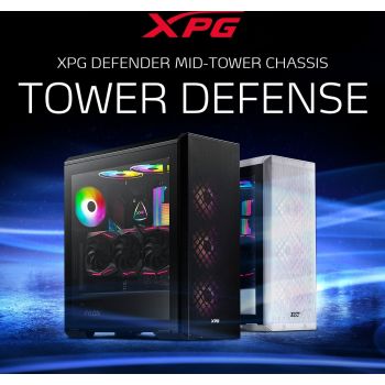XPG DEFENDER MID-TOWER CHASSIS Spacious premium E-ATX Dimension Solid MESH Front Panel with ARGB Strips Lighting Effects Design Removable Dust Filter XPG PRIME™ ARGB Combo Controller Efficient Airflow Layout, with x3 included XPG VENTO 120 ARGB Fans 3mm Tempered Glass Side Panel Support Vertical and Horizontal VGA Installation 22.8mm Depth for Cable Management XPG DEFENDER supports full-size E-ATX with MESH front panel design. A