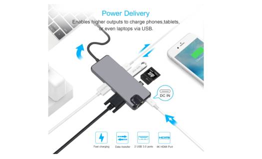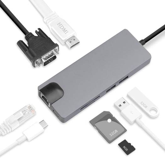 Description: This 8-in-1 Type-c hub effectively adds more ports for your laptop so as to solve the problem. Dual USB 3.0 ports allow you to store data up to 5Gbp / s speeds, which is stable and high speed. USB C to HDMI output reaches 3840×2160 @ 30 hz resolution, USB C to RJ45 Gigabit Ethernet LAN adapter allows you to enjoy ultra-fast Gigabit Ethernet speeds and wired connection reliability. What’s more, it also support USB C Hub to VGA Adapter. Characteristics: 1)Dual USB 3.0 port: u Allow to data speeds up to 5Gbp / s. Faster and more stable transmission. 2)USB-C port for power supply: you can connect the connected power-enabled usb-c laptop and hub via the usb-c charging port, while connecting multiple peripherals and sending data. 3)Type-C to HDMI supports resolution up to 4 k UHD (3840×2160 @ 30 hz). Support for 2 k / 1080 p / 720 p / 480 p / 360 pResolution, vivid video and improved audio. You can enjoy an incredible experience watching movies or make professional presentations in the conference room with a shared